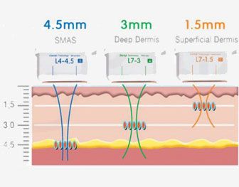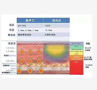 相比IPL、LASER\RF等电波拉皮,超声刀治疗深度为1.5mm-4.5mm,除了作用到纤维中隔之外,还可以作用到更深部的SMAS层。
