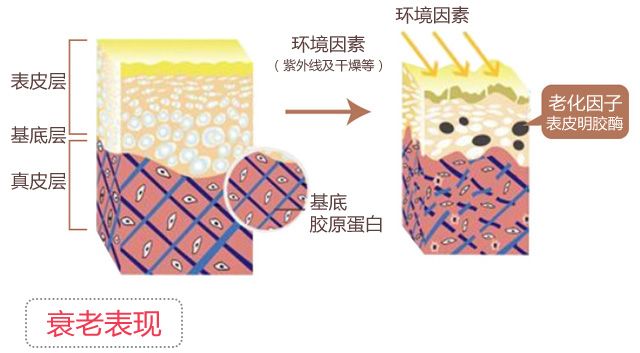 表皮细胞的更替速度变慢,导致角质层堆积,出现干纹、细纹等表皮皱纹。