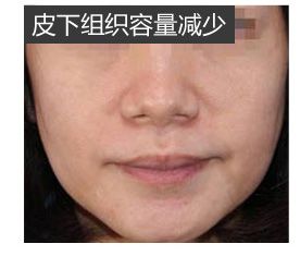 40岁以后,皮下纤维萎缩、张力减退,面部凹陷、上眼睑下垂,眼袋、鼻唇沟及下颌出现脂肪堆积等。