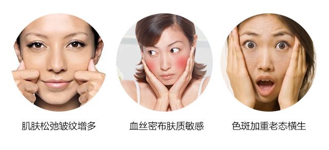 使皮肤组织萎缩、塌陷,肌肤出现干燥、粗糙、松弛、皱纹、毛孔粗大、色斑等,